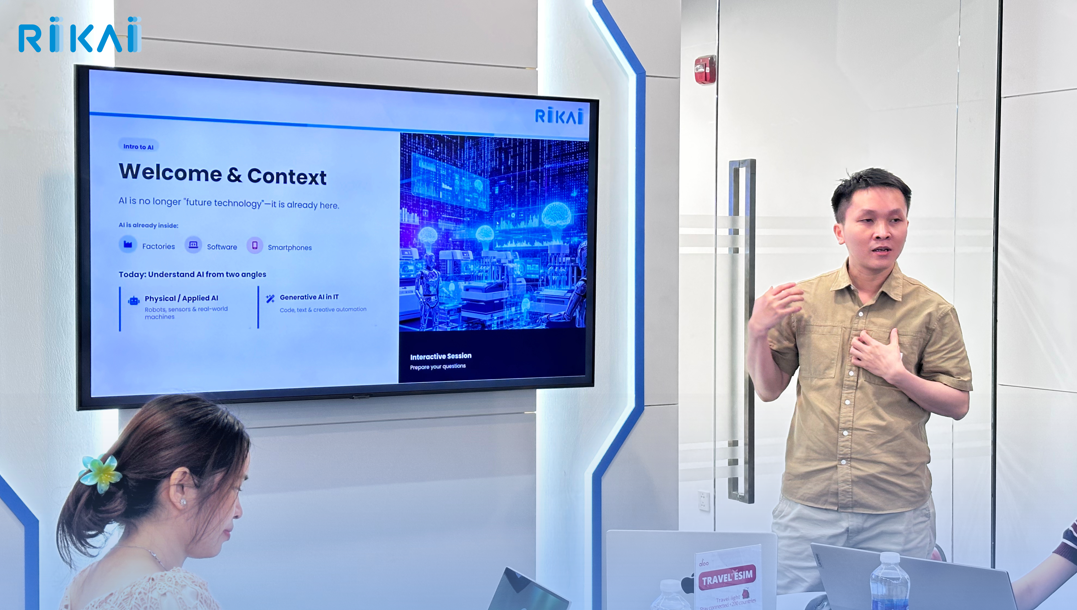 Điểm nhấn đặc biệt của chương trình là phần chia sẻ về trí tuệ nhân tạo do anh Đinh Ngọc Hoàng - R&D Manager trình bày. Thông qua các ví dụ thực tế và phần trao đổi cởi mở, buổi chia sẻ đã giúp sinh viên hiểu rõ hơn về việc ứng dụng AI trong các dự án thực tiễn, xu hướng công nghệ hiện nay cũng như định hướng nghề nghiệp trong tương lai. Đồng thời, các bạn cũng có cơ hội tìm hiểu sâu hơn về môi trường làm việc năng động, sáng tạo và chuyên nghiệp tại RIKAI Technology.